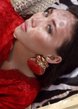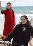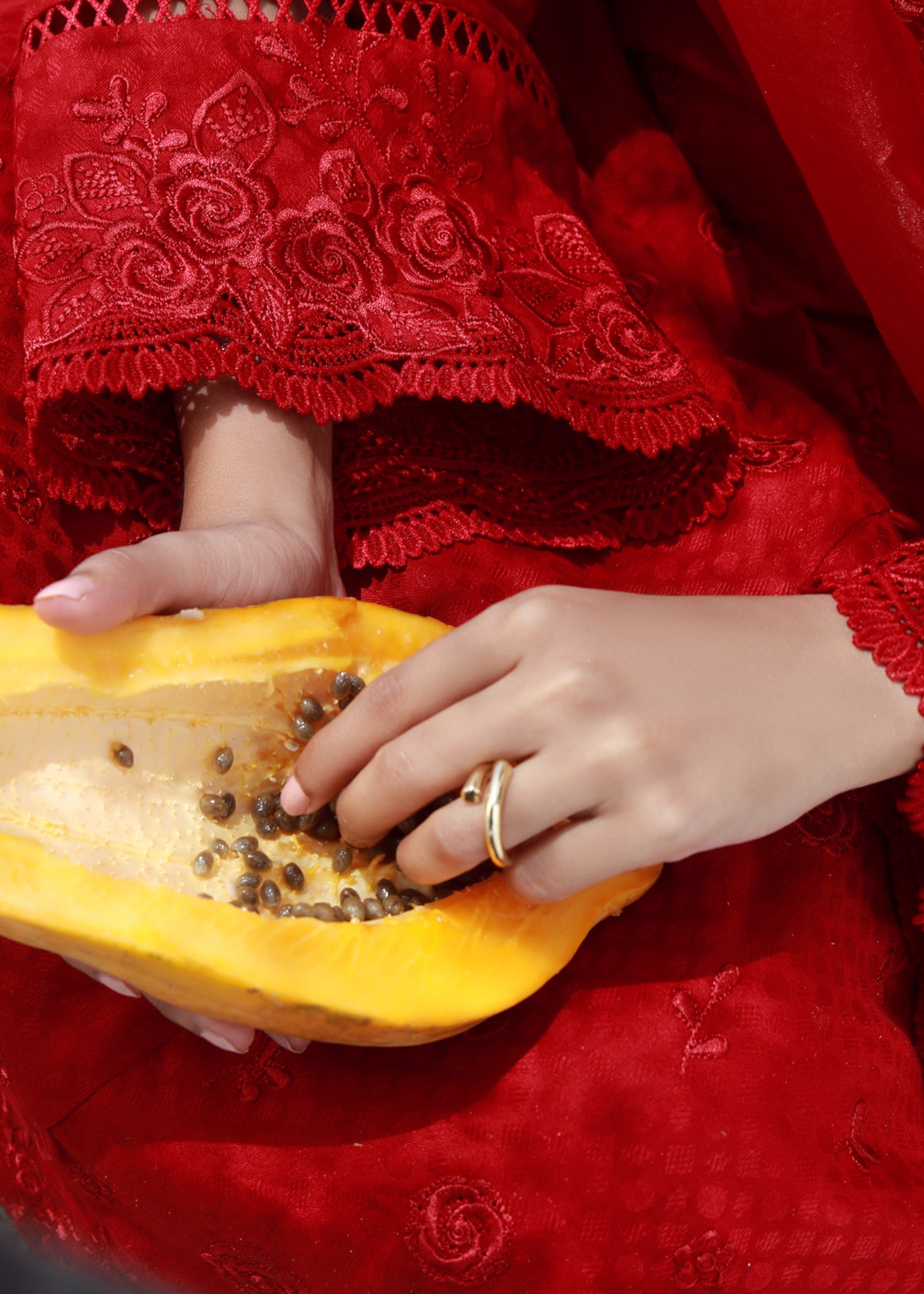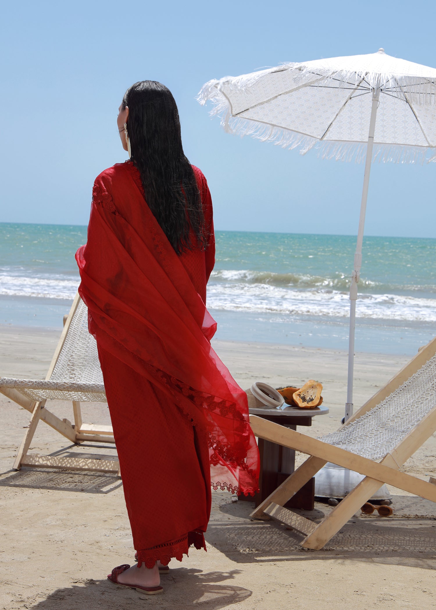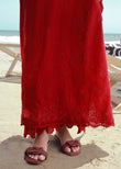 A striking red embroidered shirt designed in a three paneled A line silhouette, highlighted with embroidery along the hem, side slits, and a soft all over spray. 3D floral accents elevate the neckline, while wide open sleeves add a breezy charm. Styled with plain red straight trousers featuring intricate cutwork at the hem and finished with a cutwork and scalloped red organza dupatta for a refined yet statement.