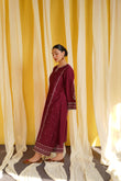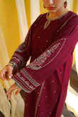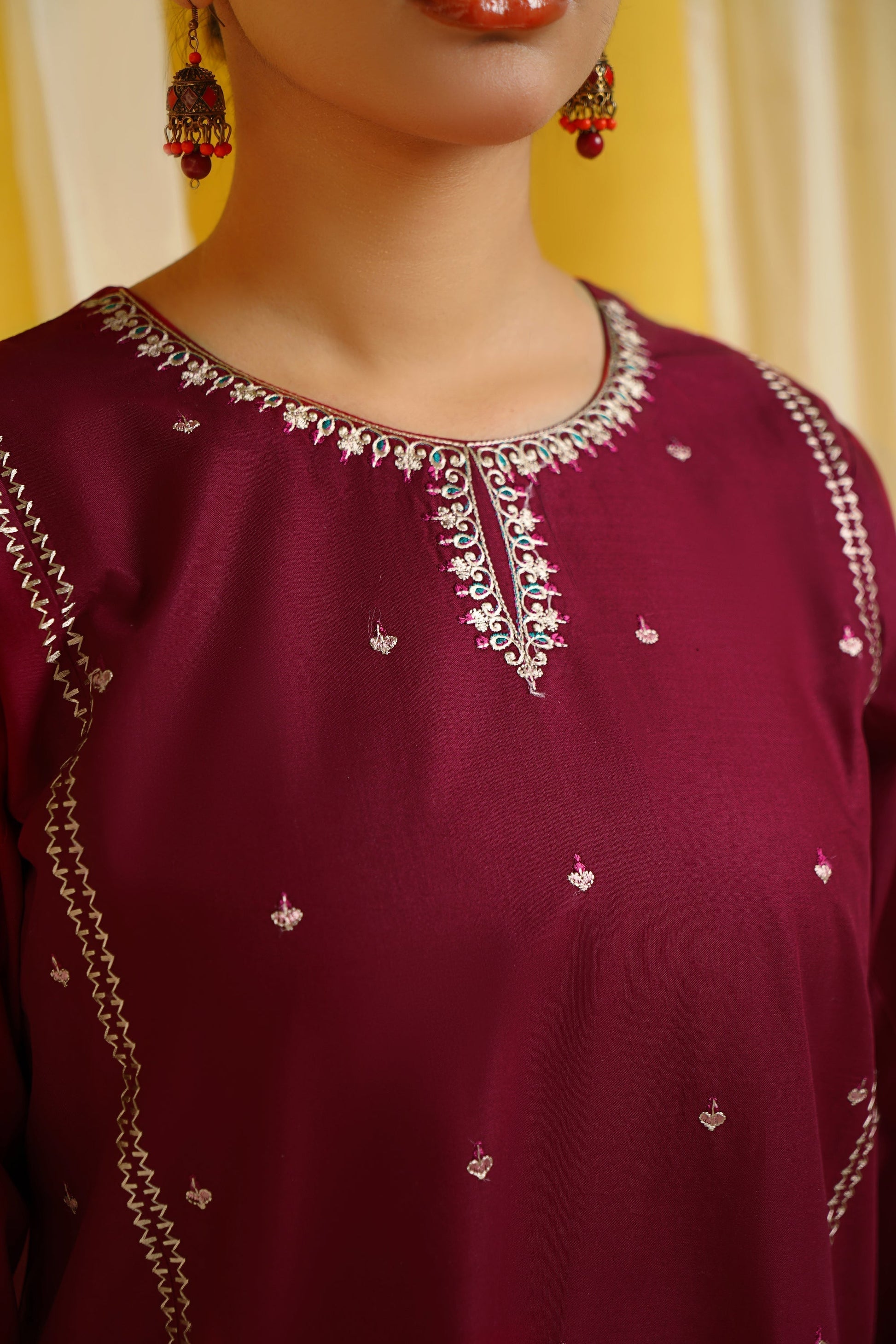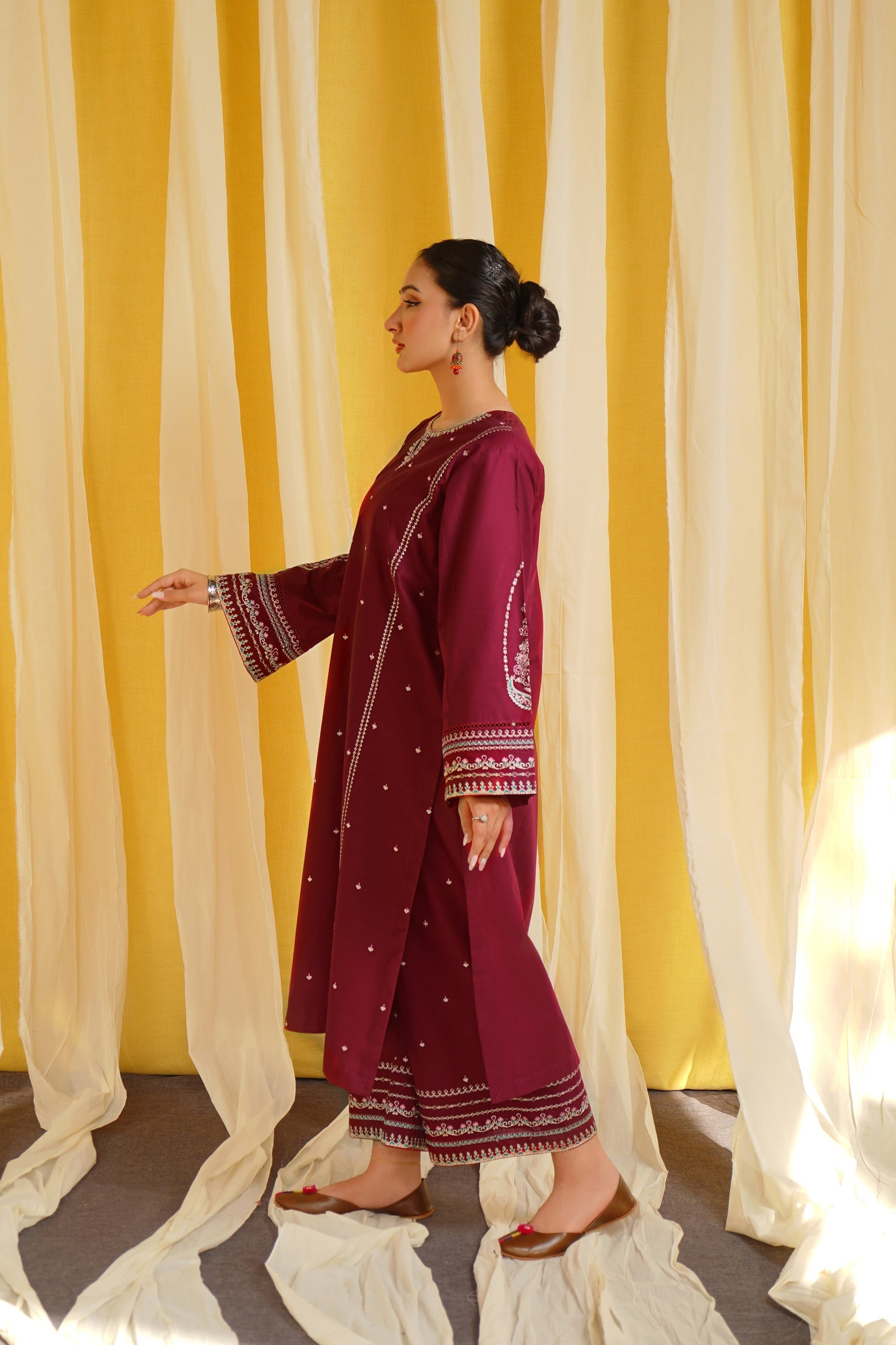 Get ready to dazzle in this two-piece Cotton suit! Featuring delicate embroidery along the neckline and a stunning spray of intricate designs on the shirt front, it's a true beauty. The sleeves are adorned with embroidered borders and charming motifs, while the loose trousers complete the elegant look